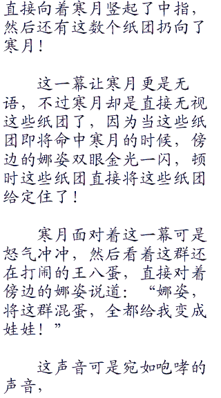 寒月将手中的咖啡放下,一个转身,躲过了这个纸团。但是那本来美妙的气氛却是直接被打破了,这一刻寒月直接怒视这那一帮人,但是看着那十几个人一起向着自己做鬼脸,寒月就是一阵无语!