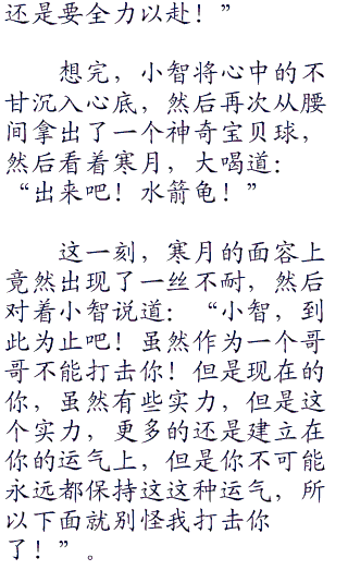 只见此刻的小智,缓缓的从腰间再次拿出了一个神奇宝贝球,然后双眼死死的盯住寒月,脸色上出现了一丝战意,但是这战意更多的是,想证明自己的实力是自己的,而不是来自寒月这个天才哥哥!