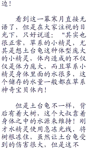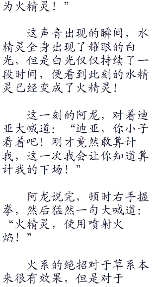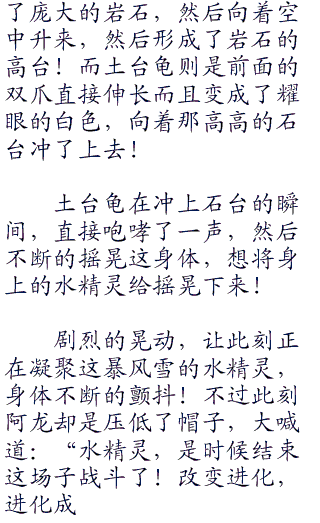但是此刻土台龟的背上竟然没有出现水精灵的影子,因为刚才阿龙直接对着水精灵说道:“水精灵,使用融水!”