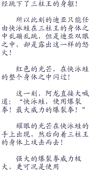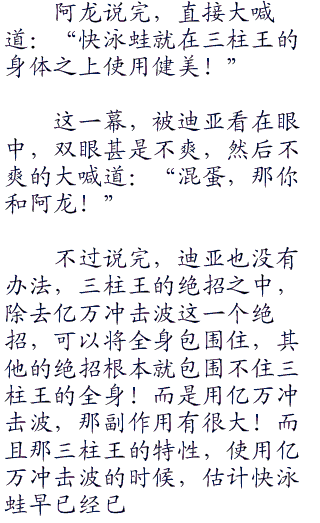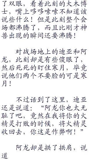 作为迪亚的对手,此刻的阿龙看着场上的三柱王,不禁的说道:“迪亚你小子竟然用神兽。”