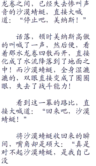 龙卷风的旋转,还有那积累的众多池水!直接命中了此刻的沙漠蜻蜓!虽然说沙漠蜻蜓的速度很快,但是那在直径快达到了五米的水龙卷下,还是被直接卷了进去!
