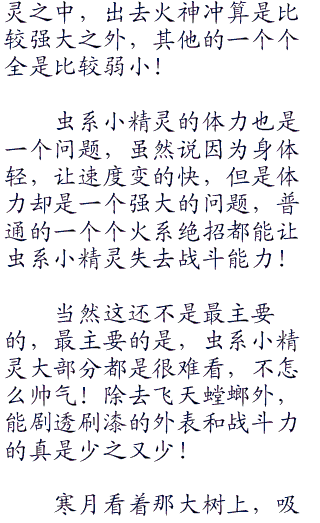 其实在神奇宝贝所有的属性之中,虫系应该是最弱的一个系别了。首先是虫系小精灵的性格一般都是温和不善于争斗,当然也有例外,毕竟如飞天螳螂便是善于战斗!但是这类的虫系,实在是太少了,而且在虫系小精