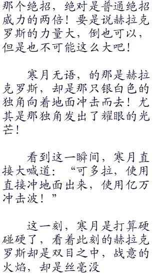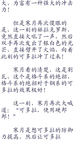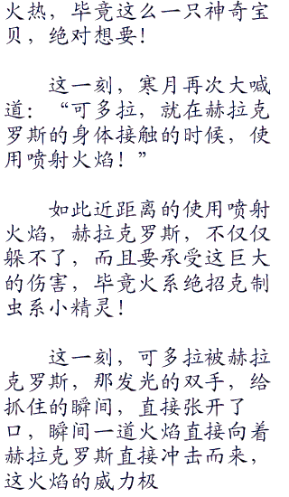 寒月,现在还是打算使用一下自己的其他小精灵,毕竟这次来到这里也是为了训练自己的小精灵的!寒月看着眼前的可多拉,还有那战意高昂的赫拉克罗斯,双眼出现了一丝火热的气息!