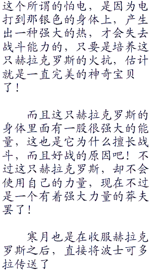 这只克拉克罗斯,不仅仅防御力强大,力量强大,速度快,而且体力大!虽然说这只赫拉克罗斯有着怕电的弱点,但是寒月试过了,