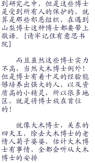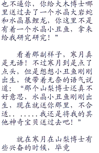 寒月看着山梨博士,只能无奈的笑了笑,对于山梨博士的话语,寒月还真不知道怎么说,毕竟山梨博士说的对的。每次寒月收服了稀有的神奇宝贝了,大木博士就跟一个老小孩一样。和其他地区的博士拉仇恨,但是光是让他们看着眼馋就是不给人家研究,久而久之,大木博