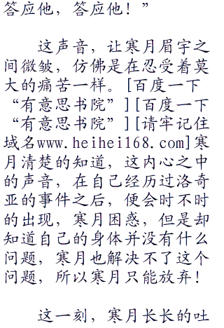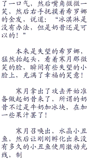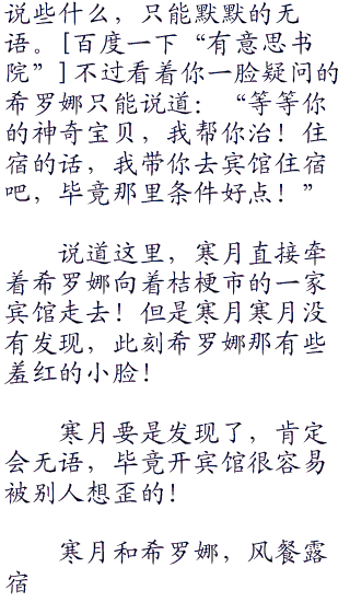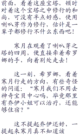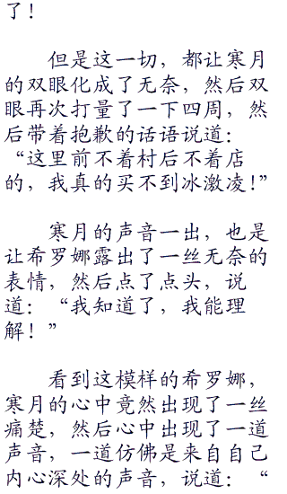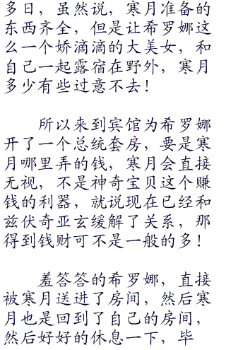 寒月很不明白,为什么希罗娜非要跟着自己,但是寒月更够猜到希罗娜和自己一定有着什么样的关系,但是这个所谓的关系,出现在未来,而不是现在,所以现在的寒月多少有些尴尬,就算是希罗娜是一个美女!
