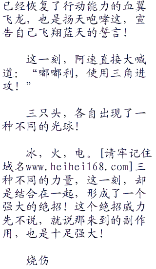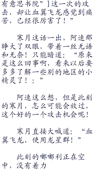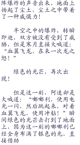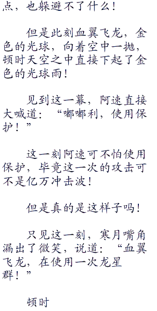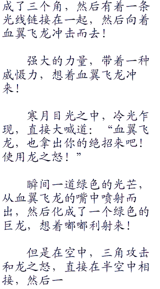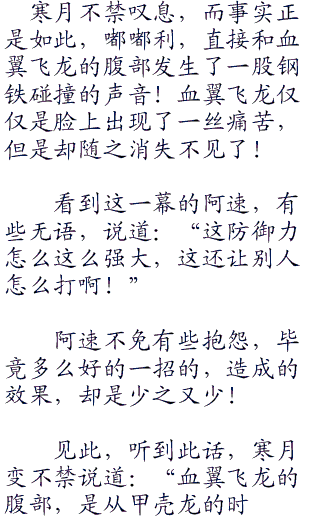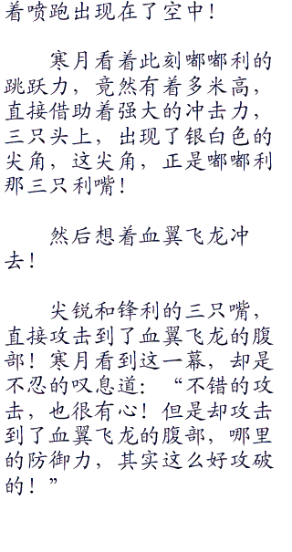 寒月看着嘟嘟利的三个头颅,还有那坚定的信念,嘴角微微一笑,然后大喊道:“要轮飞天的意志,我的血翼飞龙,可是丝毫不逊色于嘟嘟利!渴望着蓝天,终于化茧成蝶,进化成了那宽大的翅膀,飞翔于蓝天之上!”
