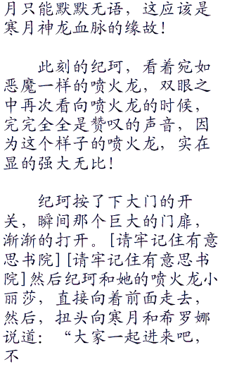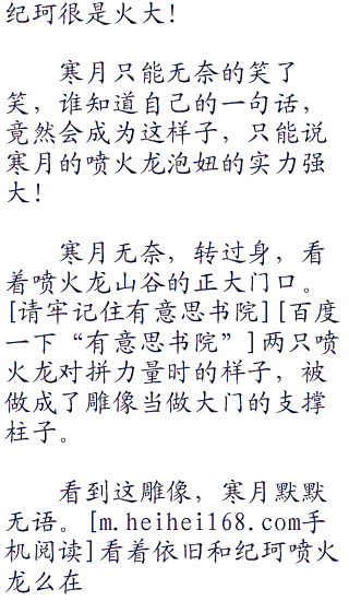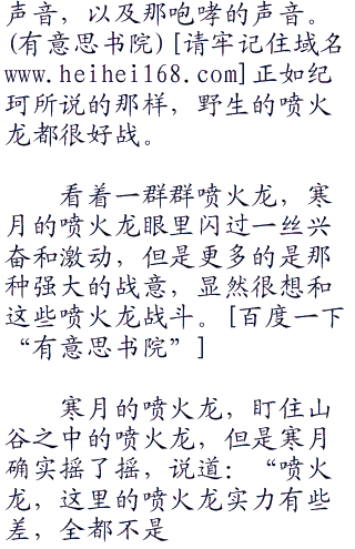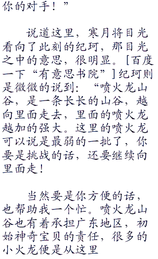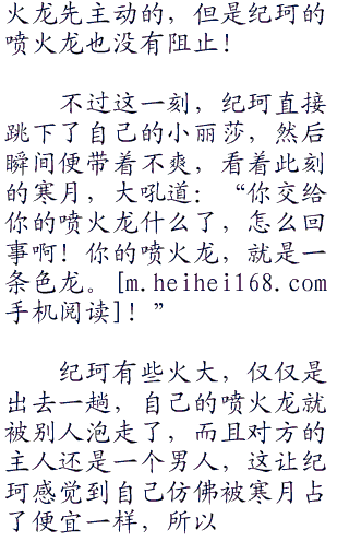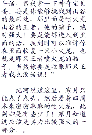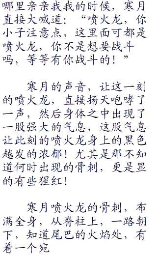 此刻寒月的喷火龙,已经和纪珂的喷火龙,并驾齐驱的来到了这个喷火龙山谷。但是寒月此刻却有些无语,因为此刻自己的喷火龙,依旧和纪珂的喷火龙聊着天,还是不是的将自己的大口对着纪珂的喷火龙。