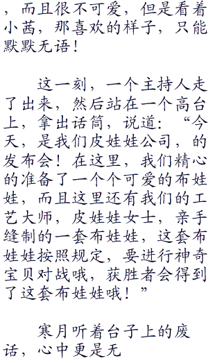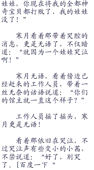 寒月的话语,让此刻小茜的哭声并没有止住,而是带着点点的哭腔,说道:“你欺负人,等等皮宝宝娃娃的首卖会上,可是有着神奇宝贝对战,赢的能够得到了珍藏版的