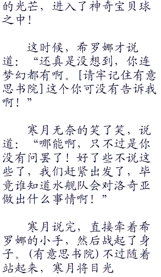 寒月走进来的瞬间,就看到了希罗娜逗弄的梦幻向着寒月飞来,然后一副可爱的样子,寒月右手在梦幻的头上拍了拍,然后拿出了大师球,说道:“你先回来吧,等等在叫你!”