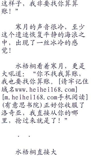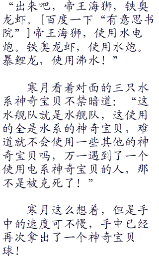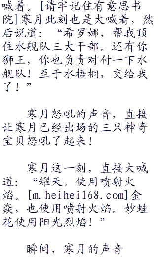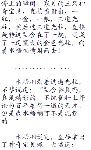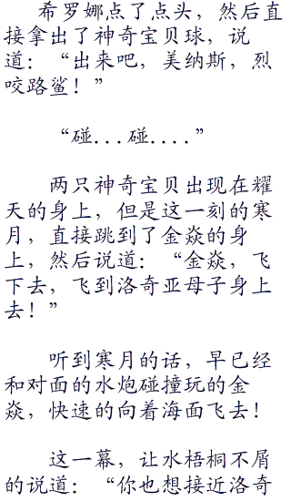 寒月看着水梧桐,目光之中,带着点点的温怒,然后将目光从洛奇亚母子的身上移开,然后对着水梧桐直接大吼道:“水梧桐是吧,你确实将我给惹火了,我的神奇宝贝你也敢动,你确定你不是在找死!”