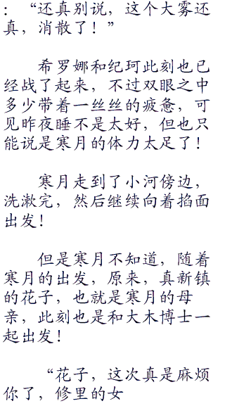 寒月默默的摇了摇头,然后在抬头看了看天,然后牵着希罗娜的小手,说道:“走,我们先去睡吧!这漫天的大雾,要等到明日太阳升起的时候,才会出现!”