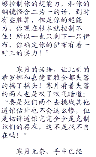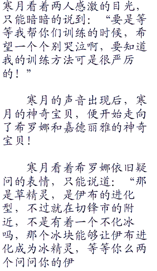 而小丑鱼虽然现在很强大,但是也要在水中,面对着冰系道馆的冰系场地,所以小丑鱼也没有用。所以娜娜你只剩下了一个伊布,一只伊布要面对三只神奇宝贝,你确定能够打赢!
