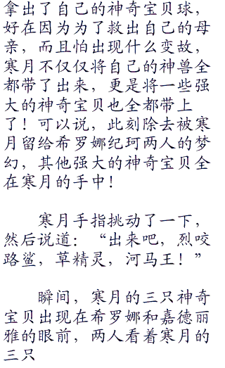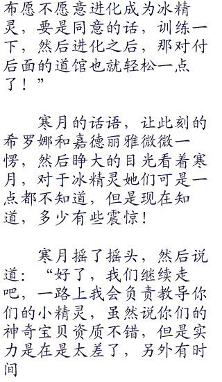 寒月看着希罗娜和嘉德丽雅的神奇宝贝,目光在两人身上扫过,带着淡淡的赞赏的语气说道:“你们的神奇宝贝很不错,但是现在全是未进化型,根本就发挥不出实力!