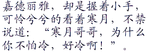 寒月走在这雪地上,单薄的衣服,却没有让寒月感觉到半点的阴冷!