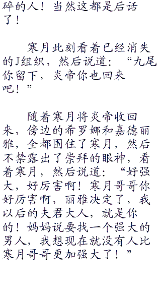 寒月漠视这一切,然后对着九尾继续大吼道:“九尾,使用燃烧殆尽,将这群人给我打飞吧!”