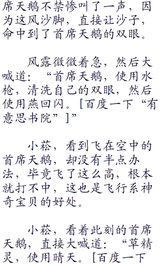 小菘,面对着首席天鹅的攻击,然后大喊道:“草精灵,使用影子分身,躲避燕返,然后使用飞沙脚。”
