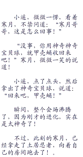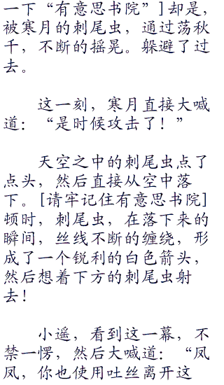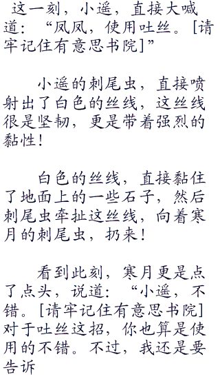 小遥,一脸认真的看着寒月,然后大喊道:“寒月哥哥,我一定会努力的!上吧,凤凤,使用毒针!”