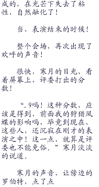 随着时间的推移,这一刻,薇薇安,才开口说道:“真是,华丽的比赛。下面,三位评委,请给我们的寒月选手打分!”