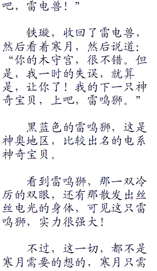 不过,寒月目光之中的精光,丝毫不见,减弱,而是直接喝道:“木守宫,电光一闪之上,在使用高速移动。然后,使用吸收拳,至于如何用,你自己知道!”