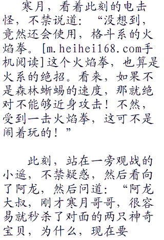 寒月的双眼,看着此刻的电击怪,不禁点了点头,暗道:“这只,电击怪的实力,和刚才的雷电兽以及雷鸣狮,差不多。不过,在细节上,应该是电击怪,强上一点。毕竟人形神奇宝贝,能够充分的利用双手的力量,尤其是格斗系的绝招,会提升很多。毕竟电击兽,能够使用格斗系绝招,于其
