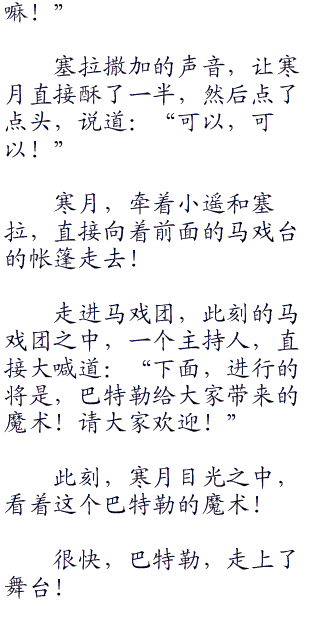 寒月,本来低着的头,顺着塞拉的手指,一看,不禁说道:“马戏团,这里怎么有马戏团!”