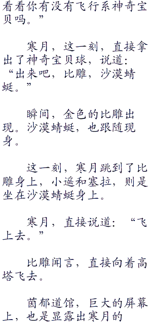 寒月,在神秘山谷,收服了比雕。这比雕实力强大,而且还是闪光神奇宝贝,在加上比雕能够超进化,寒月才敢这么说,这一次比赛就靠比雕了!