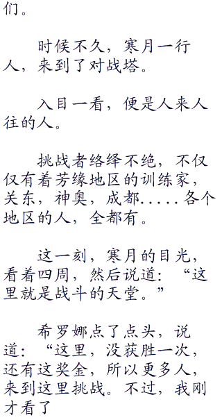 希罗娜,牵着寒月的手中,说道:“你看,那就是芳缘地区,赫赫有名的战斗塔。这战斗塔一共有着一百层。每一层都是挑战的地方。