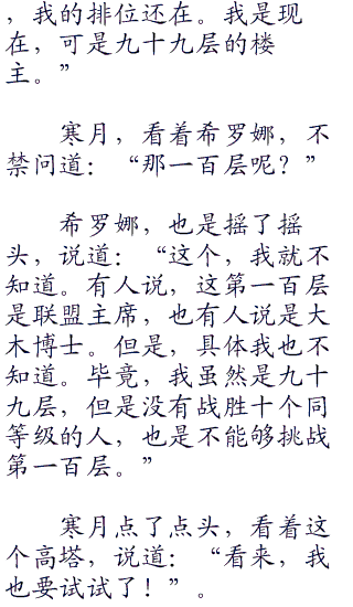 每一层,战胜十个训练之后,便获得一次挑战楼主的机会。每升高一层,那楼主的实力,也不是一个档次。可以说,这是一个训练和战斗的好地方。我曾经,在这里停留了差不多三个月,就是为了挑战到一百层。”