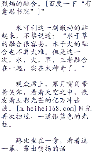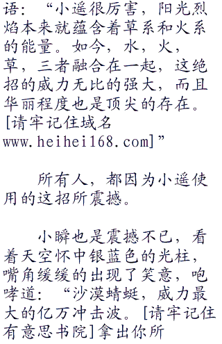 小遥目光之中出现一丝光彩,嘴角出现一丝笑容,一丝享受的笑容。小遥清脆的笑声:“呵呵.....好棒的感觉。我喜欢这种战斗,这种战斗的感觉。妙蛙花,美纳斯,拿出你们最强大的力量,融合吧,融合水炮和阳光烈焰。”
