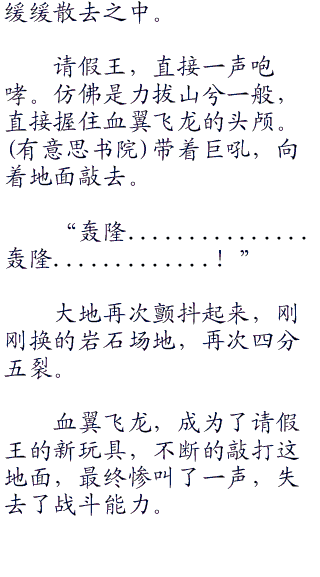 血翼飞龙,仇恨的目光看着请假王。对于抢走自己地盘的人,血翼飞龙是狠狠的虐一顿,然后将其赶走。如今,对于抢走自己喜欢之人的家伙,那绝对要虐上个千百遍,然后让其生活不能自理。