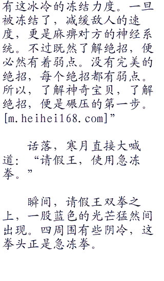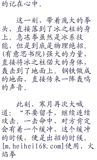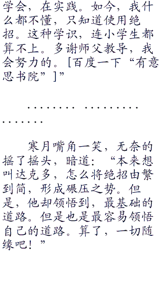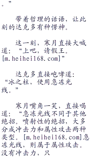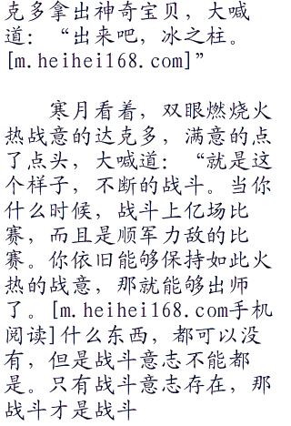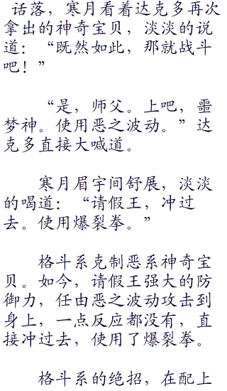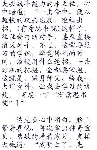 寒月目光凝视这达克多,严肃的目光之中,带着一丝冷厉说道:“达克多,拿出你的神奇宝贝。继续战斗,战斗是不会终止。一个人的战斗从出生那一刻便开始了,一生不断的战斗,这才是一个训练家。你的意志在战斗,你的神奇宝贝在战斗,你的身体也在战斗。所以,永远不要忘记战斗意志。