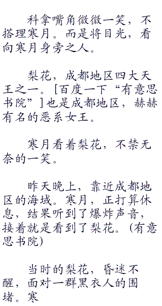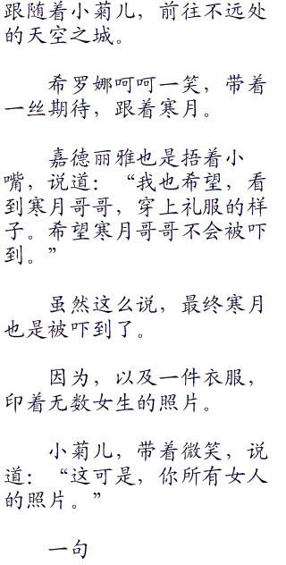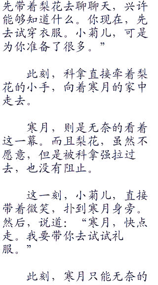 小菊儿在一旁呵呵直笑,说道:“娜娜,估计寒月一会就到。你没有必要这么着急!”