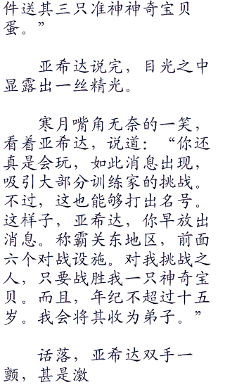 此刻,亚希达趁着寒月的婚礼。直接,跑去邀请一些训练家,前来挑战。更是,寻找到水晶,阿金,小银,这三位。这三位实力,也是接近于冠军。为此,亚希达也算是用尽方法,最终使用激将法,将三人绑上对战设施这个团队。答应,成为对战首领。成为,成都地区的对战区域。