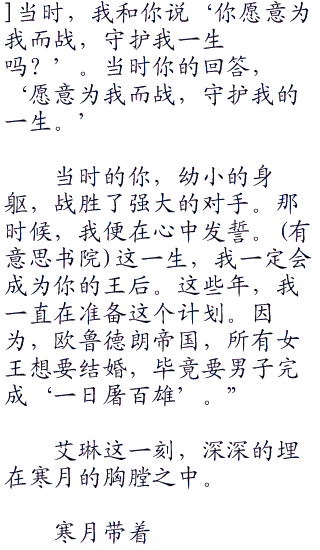 说完,艾琳双眼凝视这寒月,带着深情,带着爱意,带着.............