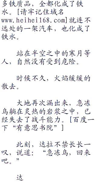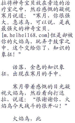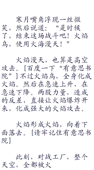 殊不知,此刻的寒月,则是大喊道:“应该结束了。达拉想来你也明白了。物理攻击,对于火焰鸟来说,根本就无效。下面,就是特殊攻击了。火焰鸟,使用燃烧殆