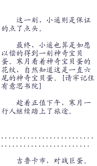 时候不久,小佳带着喜悦的目光走出来,说道:“小遥姐姐,希罗娜姐姐,灵儿姐姐,寒月哥哥!你们跟我来,我带你们去看看神奇宝贝蛋!”