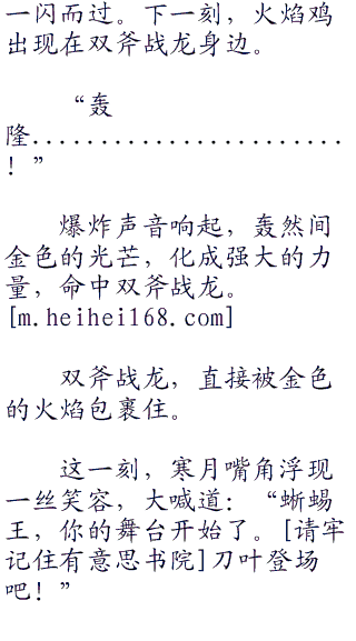 这些老者话语,寒月并不知道。此刻,寒月目光凝视希尔斯,直接咆哮道:“双斧战龙,裂牙陆鲨。两只龙系神奇宝贝。双龙战术,公认的双打顶尖战术。不过,我的蜥蜴王和火焰鸡,可不是你们想想之中的草和火!”