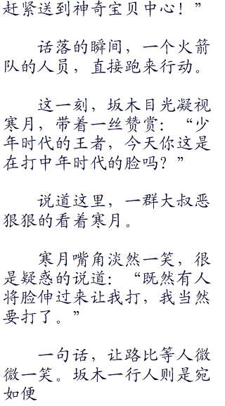 毕竟,这一代的少年,一个个都是不服输的主。他们的王者有着各种神兽,他们也努力收服神兽。也不知寒月从哪里得到这么多神奇宝贝消息,愣是弄的他们很多人都有一只神兽在手。另外,还有强大的实力,我只能说我现在有点小怕!”