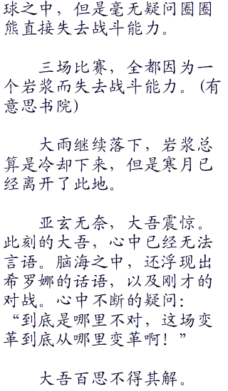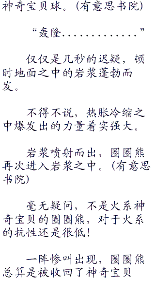 一瞬间,亚玄愣住了。因为这一瞬间,圈圈熊只有两个选择,一个是回到神奇宝贝球之中,一个是在这岩浆之中挺住。两只方法,全都会输。毕竟亚玄已经是第三只神奇宝贝,收回去便是直接认输。