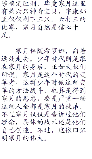 希罗娜缓缓走到寒月身边,轻轻将御天拥进怀中:“怎么了,今天你可是王者。一个人带领着少年时代挑战整个中年时代。中年时代的大叔,此刻应该有种哀伤吧!”