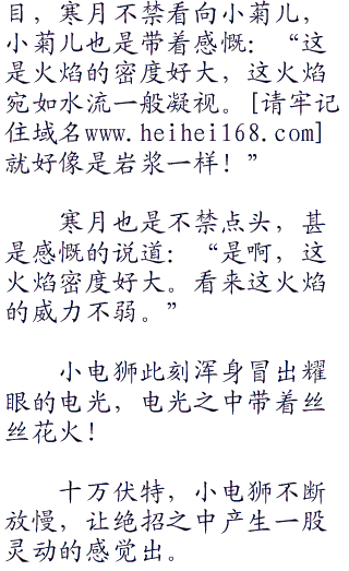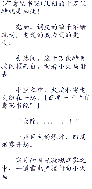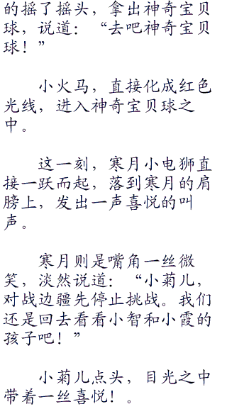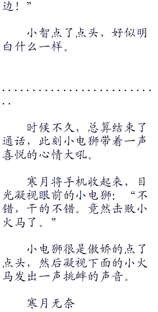小菊儿无奈,想起午饭的时候。小电狮自告奋勇,将自己的一个对手告诉寒月。这让正烦恼收服什么神奇宝贝的寒月不禁一喜。不得不说,小电狮很是聪明,将自己的对手告诉了寒月,更是在前面带路去寻找小火马。