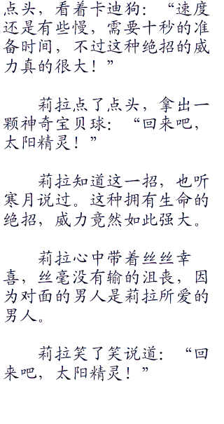 寒月嘴角浮现一丝微笑,淡然说道:“不错,不错........太阳精灵好强大的念力,不过我的卡迪狗可不仅仅如此。”