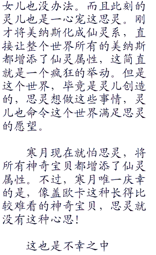 论速度,美纳斯的速度不是很快,在寒月的神奇宝贝之中,根本就不占据一点优势。但是,在这些普通神奇宝贝之中,美纳斯绝对是无敌的存在。