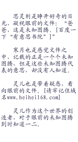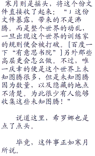 此刻,寒月看着眼前的文件。文件是一种奇怪的文字。寒月看着文字有些奇怪,因为这些文字好像是未知图腾!希罗娜看着眼前的文件,嘴角浮现一丝疑惑。