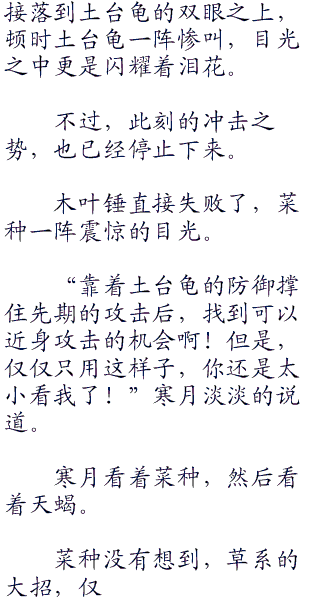 菜种则是一脸暗淡,眼前的美丽花可是自己辛辛苦苦训练,小范围的挪移技能,可是让很多人都是难以对付。如今美丽花,仅仅在寒月手下走了两回合。