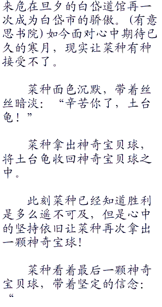 这些年,菜种一直在心中默念,一直在心中坚持,一直坚持一天战胜寒月。为了这个目的,菜种进行艰苦的训练,让本
