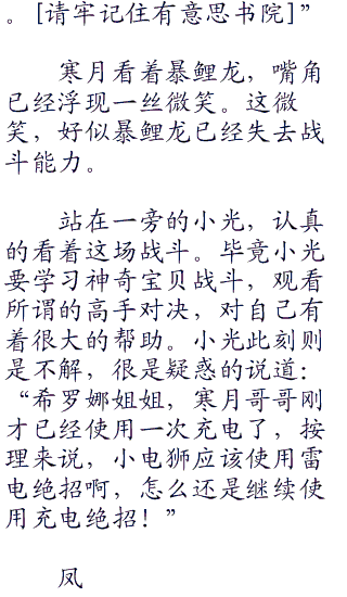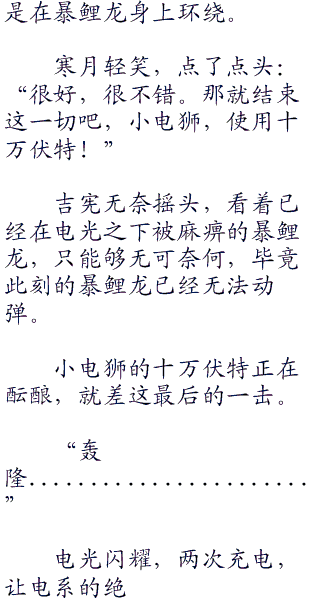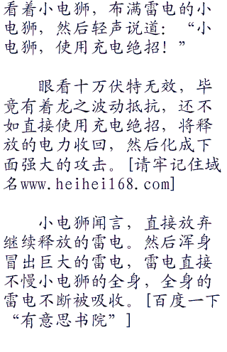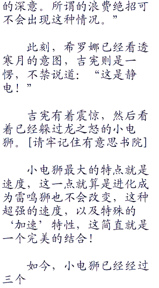 小电狮,寒月已经收服很久,压制进化的时间更是长久。除去因为寒月不想让小电狮进化,另外就是因为小电狮的资质。寒月的这只小电狮,拥有者‘加速’特性,这个特性会让小电狮,每一个回合的速度极限的提升。这种速度,造成的后果便是速度极快,甚至超越寒月的蜥蜴王。为此,寒月对于小电狮极其看中,也算是着重培养,压制小电狮的进化,更是在不断的开发小电狮的潜力。
