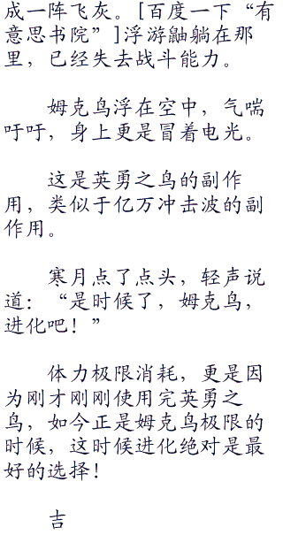 这一刻,通过电光一身,燕返,燕回闪,三次绝招的加速。姆克鸟,直接燃烧起熊熊大火,落到水面的低空风行,直接化成也敢巨大的光罩。蓝色的光芒因为速度的原因很大,简直就像是一直蓝色的火焰鸟出现一般。