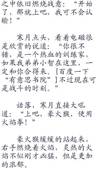 寒月看着豪火猴,很是激动的大喊道:“战斗吧,豪火猴,使用喷射火焰!”